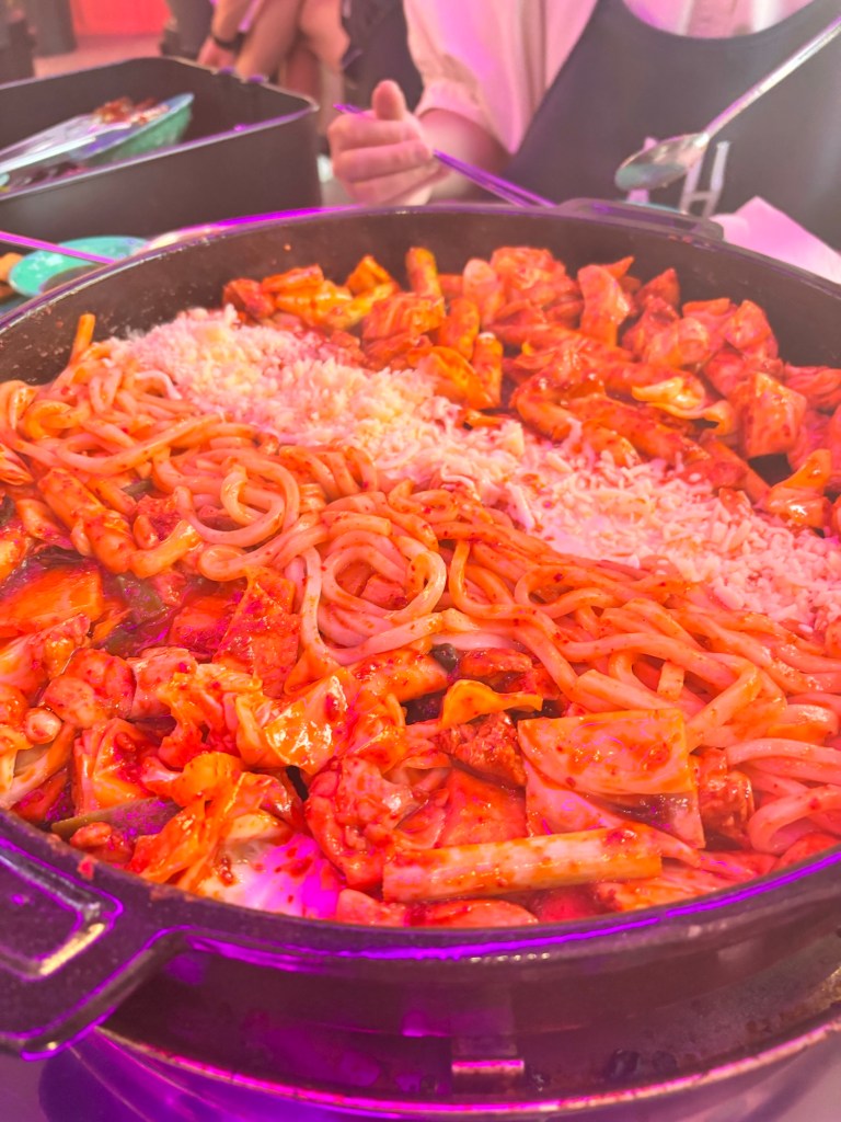 Seated around a round table with a built in hot-plate, we watched as the staff poured the Dakgalbi onto the sizzling pan and told us to keep mixing and cutting it into pieces. Naturally, we took the first instruction very seriously, but completely ignored the second. After a few minutes of stirring and staring at the uncut chicken and vegetables, the staff must have decided we were beyond help. One stepped in, took the spatula and scissors, and saved us from our own incompetence.