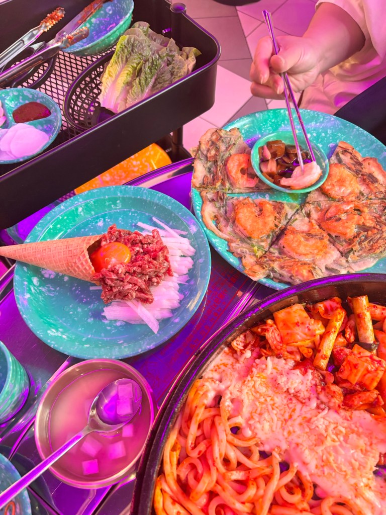 Now, when i booked the table, I left a note about a birthday. And then, like a true friend, I immediately forgot about it. Cue the lights dimming, the music blasting, and a special Korean sweet pancake (Hotteok) with a candle and ice cream appeared at our table, my birthday friend looked mortified, and I look… confused. Turns out, I surprised myself.